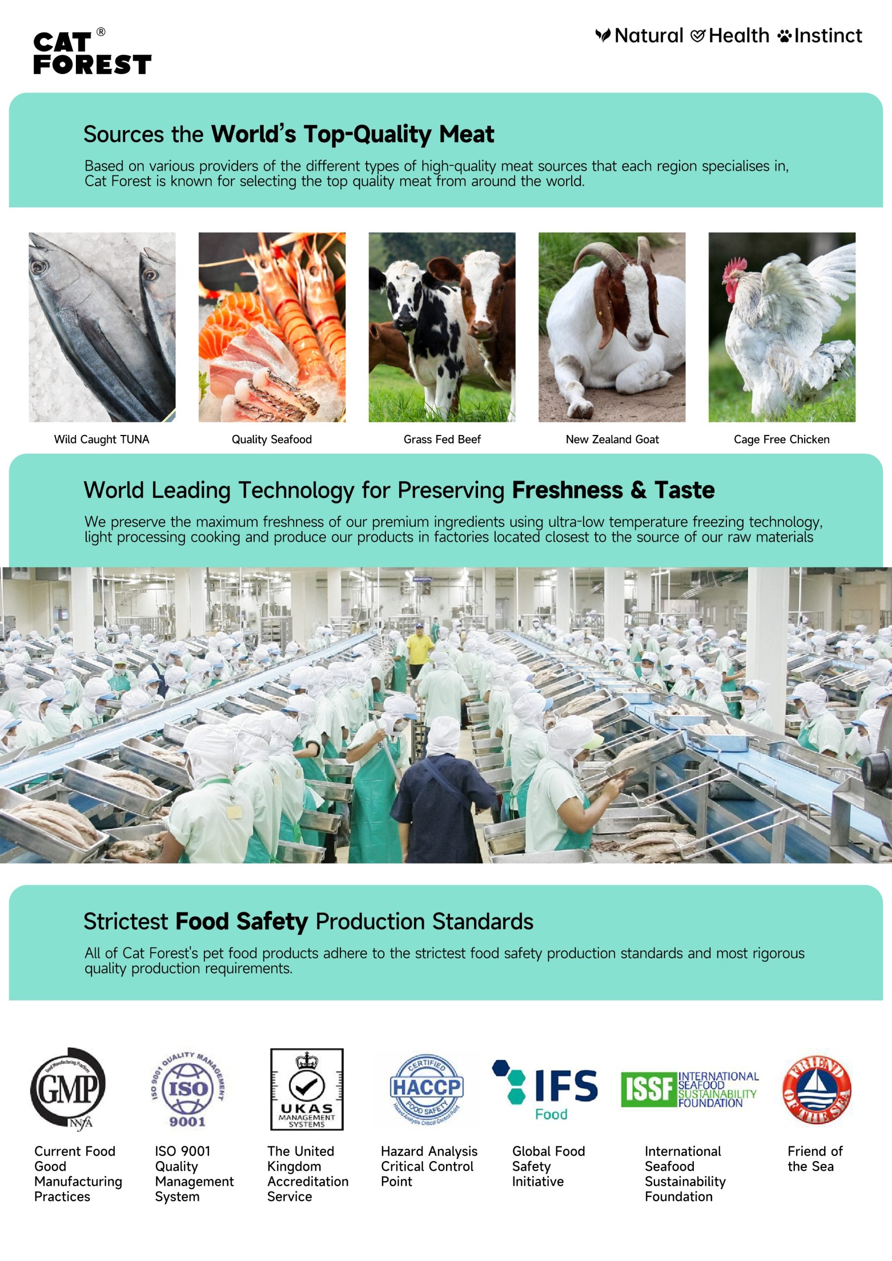 CAT FOREST Premium Tuna White Meat with Shrimp in Gravy Cat Canned Food 85g is 100% made with real, fresh meat, and contains 20% more meat than other brands. Packed with omega-3 & 6 fatty acids to nourish cats' skin and coats, and EPA & DHA for brain development and uses sustainably sourced, dolphin-safe tuna, and avoids grains and unnecessary preservatives. The tasty base will entice even the fussiest cats, and the high digestibility and palatability make it an ideal daily meal. Hydration helps support cats' health too. Made in Thailand to the highest quality standards.